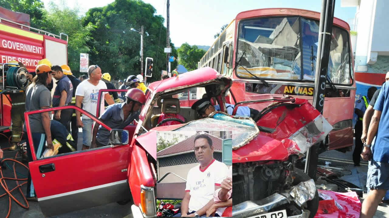 Il est 8 h 40 dimanche. Le tout-terrain rouge arrive aux feux de signalisation à l’angle des rues Volcy-Pougnet (ex-rue Madame) et Labourdonnais. Les feux ne fonctionnaient pas. Et soudain, c’est l’impact. Un autobus individuel faisant route vers l’hôpital Dr A. G. Jeetoo percute l’avant du tout-terrain. Salim Ramthmeah était sur la banquette passager. Le choc est terrible. Sous la violence de l’impact, le parebrise du tout-terrain vole en éclats. Ce terrible accident cause un embouteillage.
